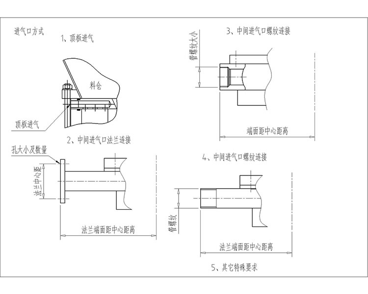 1、先將給料機(jī)與料倉用螺栓連接緊固,中間需有密封墊(圈),保持密封,再將進(jìn)氣口和出料口分別與外部的管路相連接;給料機(jī)軸承座上有三處接口,分別為平衡孔、吹掃孔、注油孔,平衡孔與吹掃孔連接一路氣源,注油孔每三個(gè)月加注一次黃油。三處接口在不同的給料機(jī)軸承座上的位置不同,請現(xiàn)場查看指示牌。