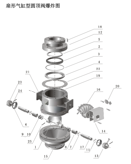 5. 如果扇形氣缸型圓頂閥水平安裝,必須保證圓頂閥在開啟狀態(tài)時,圓頂(件 1)處于閥的上半部。